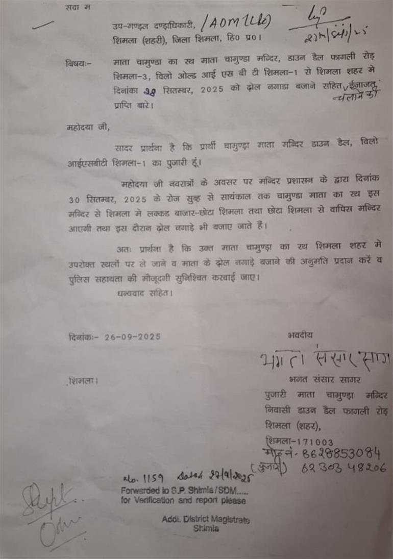 मंदिर कमेटी ने इस आयोजन को लेकर जिला प्रशासन को पत्र लिखकर पुलिस सहायता और सुरक्षा इंतज़ाम की मांग की है। 26 सितंबर को एडीएम शहरी और एसपी शिमला को भेजे गए पत्र में कहा गया है कि रथयात्रा के दौरान भारी भीड़ उमड़ने की संभावना है, ऐसे में सुरक्षा और यातायात व्यवस्था सुनिश्चित की जाए।