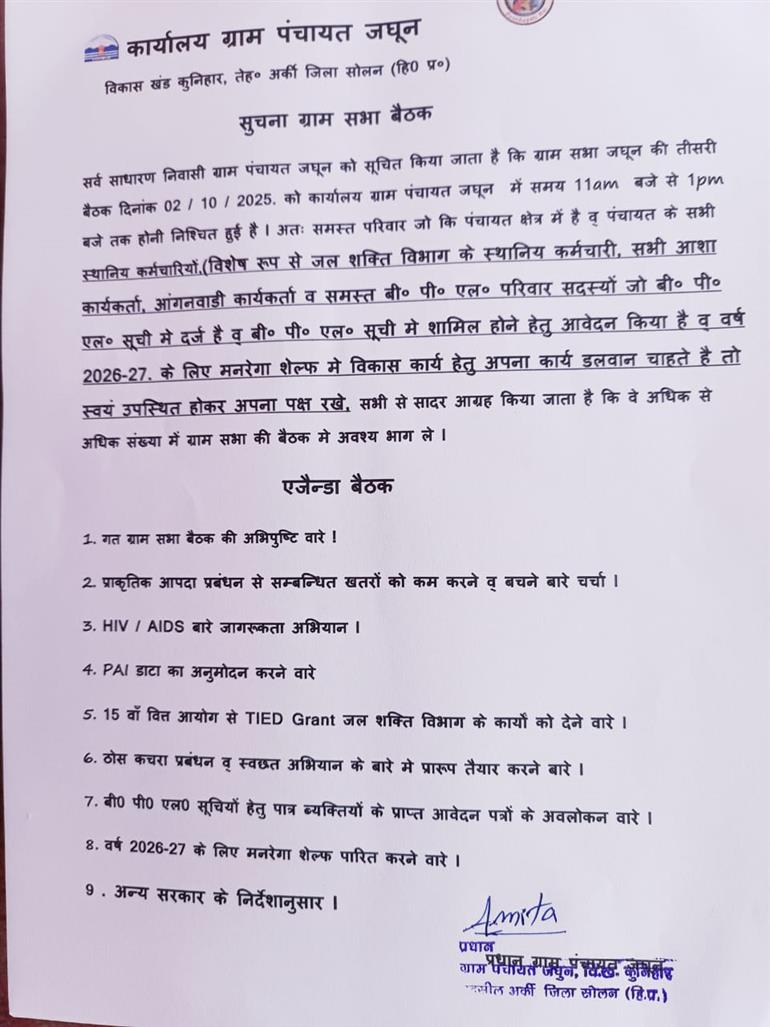 अर्की (सोलन): ग्राम पंचायत जघून में 2 अक्टूबर 2025 (गुरुवार) को ग्राम सभा की तीसरी बैठक आयोजित की जाएगी। यह बैठक पंचायत कार्यालय में सुबह 11 बजे से दोपहर 1 बजे तक होगी। पंचायत क्षेत्र के सभी परिवारों और सदस्यों को बैठक में उपस्थित रहने का आह्वान किया गया है ताकि गांव के विकास संबंधी निर्णय सभी की सहभागिता से लिए जा सकें।