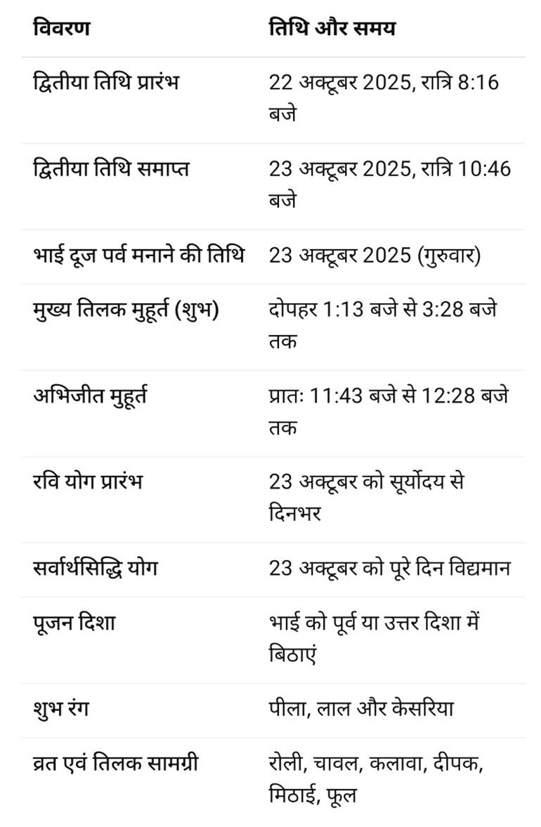 हिंदू धर्म में उदयातिथि का विशेष महत्व होता है, इसलिए पर्व का उत्सव 23 अक्टूबर को ही मनाया जाएगा। तिलक और पूजन का शुभ मुहूर्त दोपहर 1 बजकर 13 मिनट से 3 बजकर 28 मिनट तक रहेगा। इन पवित्र क्षणों में बहनों द्वारा किया गया तिलक भाई के जीवन में मंगलता, दीर्घायु और समृद्धि लाता है।
