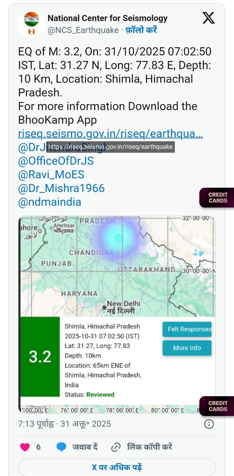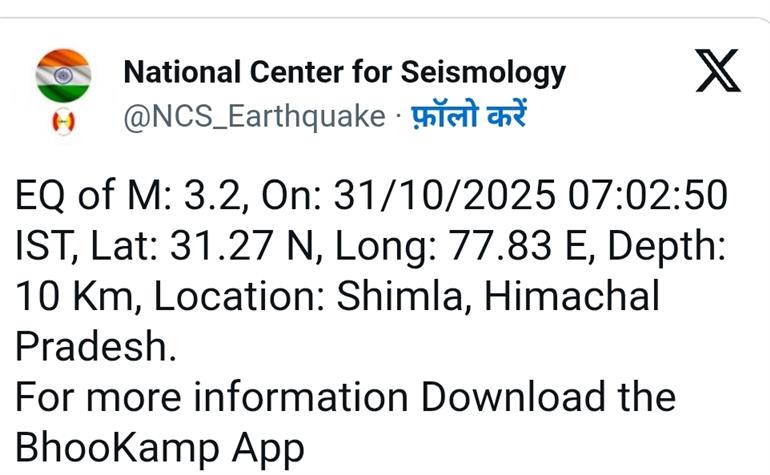 शिमला में 3.2 तीव्रता का हल्का भूकंप: पहाड़ हिले, झटके महसूस, जान-माल की कोई हानि नहीं - पढ़ें पूरी खबर..