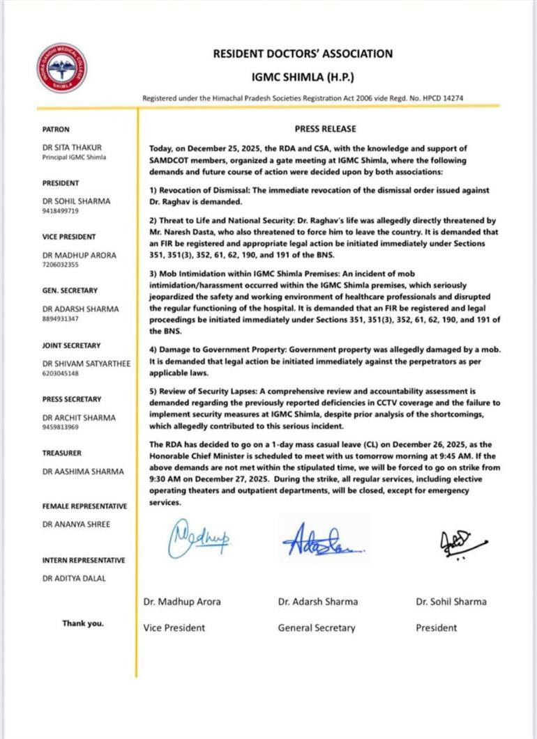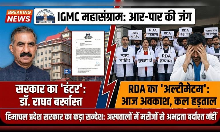 हिमाचल प्रदेश के सबसे बड़े चिकित्सा संस्थान आईजीएमसी (IGMC) शिमला में डॉक्टर की बर्खास्तगी को लेकर सरकार और चिकित्सा जगत के बीच अब आर-पार की जंग छिड़ गई है। जहाँ एक ओर सुक्खू सरकार ने अनुशासन का कड़ा हंटर चलाते हुए मरीज अर्जुन सिंह से मारपीट के आरोपी डॉ. राघव नरूला का अनुबंध तत्काल प्रभाव से रद्द कर दिया है, वहीं रेजिडेंट डॉक्टर एसोसिएशन (RDA) ने इस कार्रवाई को 'भीड़तंत्र के आगे घुटने टेकना' करार देते हुए मोर्चा खोल दिया है। एसोसिएशन का आरोप है कि डॉक्टर को जान से मारने की धमकियां दी गईं और अस्पताल में सुरक्षा की भारी कमी है। आज, 26 दिसंबर को सभी रेजिडेंट डॉक्टर सामूहिक अवकाश पर चले गए हैं, जिससे स्वास्थ्य सेवाएं चरमरा गई हैं। डॉक्टरों ने साफ चेतावनी दी है कि यदि मुख्यमंत्री के साथ बैठक में बर्खास्तगी आदेश रद्द नहीं हुआ, तो 27 दिसंबर से इमरजेंसी को छोड़ बाकी सभी सेवाएं पूरी तरह ठप कर दी जाएंगी। पढ़ें पूरी खबर..