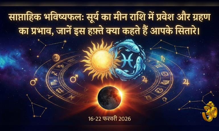 "साप्ताहिक भविष्यफल (16 - 22 फरवरी 2026): यह सप्ताह ग्रहों के बड़े परिवर्तन का गवाह बनने जा रहा है। 17 फरवरी (मंगलवार) को साल का महत्वपूर्ण सूर्य ग्रहण लगने जा रहा है, जिसका प्रभाव सभी 12 राशियों पर अगले कुछ महीनों तक दिखाई देगा। इसके साथ ही, सूर्य का कुंभ से मीन राशि में गोचर आपके आत्मविश्वास और कार्यक्षेत्र में नई दिशा तय करेगा। इस विशेष रिपोर्ट में पढ़ें—मेष से लेकर मीन तक, आपके स्वास्थ्य, आर्थिक स्थिति और पारिवारिक जीवन का विस्तृत लेखा-जोखा और सटीक उपाय।"