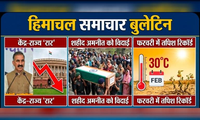 शिमला: (HD News); हिमाचल प्रदेश में आज राजनीतिक सरगर्मियों से लेकर मौसम के बदलते मिजाज तक कई बड़ी खबरें सुर्खियों में रहीं। एक ओर मुख्यमंत्री सुखविंदर सिंह सुक्खू ने 'राजस्व घाटा अनुदान' (RDG) में कटौती को लेकर केंद्र सरकार के खिलाफ मोर्चा खोलते हुए इसे राज्य के विकास में रोड़ा करार दिया है, तो दूसरी ओर कांगड़ा के जवाली में शहीद अग्निवीर अमनीत कुमार को पूरे सैन्य सम्मान के साथ अंतिम विदाई दी गई। इस बीच, प्रदेश में असमय बढ़ती गर्मी ने बागवानों की चिंता बढ़ा दी है, जहां शिमला और कल्पा में फरवरी के तापमान ने पुराने रिकॉर्ड तोड़ दिए हैं। स्वास्थ्य के मोर्चे पर दवा उद्योग से जुड़ी बड़ी चिंता सामने आई है, जिसमें बद्दी की कई फार्मा कंपनियों के ड्रग सैंपल फेल पाए गए हैं। पढें विस्तार से..
