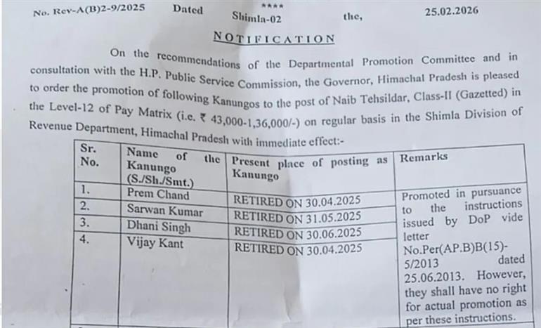 25 फरवरी 2026 को अतिरिक्त मुख्य सचिव (राजस्व) कमलेश कुमार पंत द्वारा जारी की गई अधिसूचना ने सचिवालय से लेकर जिला मुख्यालयों तक खलबली मचा दी है। इस सरकारी आदेश में स्पष्ट रूप से उल्लेख किया गया है कि सोलन जिले से संबंधित चार पूर्व कानूनगो—प्रेम चंद, सरवण सिंह, धनी सिंह और विजय कांत—को नायब तहसीलदार के पद पर पदोन्नत किया गया है। आदेश में यह भी कहा गया है कि इन नवनियुक्त अधिकारियों की पोस्टिंग के आदेश अलग से जारी किए जाएंगे। अब सवाल यह उठता है कि जो व्यक्ति विभाग की दहलीज छोड़ चुके हैं, उनकी 'पोस्टिंग' कहाँ और किस आधार पर होगी?